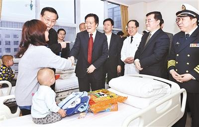 3月9日,出席十二届全国人大二次会议的省委书记、省人大常委会主任周本顺,省长张庆伟专程前往海军总医院,亲切看望正在这里接受免费治疗的我省贫困家庭先天性心脏病患儿。(记者 王玉亮 郭昭摄)