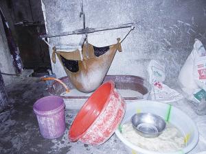记者看到,靠近墙角的地方堆放着很多面粉和碱面,环境阴暗潮湿。在房子门口处的台阶上,并排放着用塑料袋盛装的已加工好的酿皮,而很多用塑料袋装着的面筋竟然堆放在地上。“你看看,我们做的酿皮颜色多正,一袋10斤。我们有专门的销路,你如果要的多就留个电话。”男子领着记者看了一圈,给记者说道。