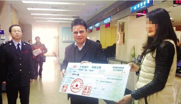 在交了4万元个人所得税以后,小许从地税局长吴振坤手中接过了20万元大奖的支票。