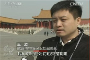故宫博物院保卫处治安管理科张维健告诉记者,这名女子是从事非法一日游揽客的,属于非法经营,巡查的保安人员发现以后,上前对她劝阻。她不服从管理,还对保安进行侮辱:“你们就不会睁一只眼闭一只眼吗?差不多就得了!为什么非往那儿去啊,狗屁。”
