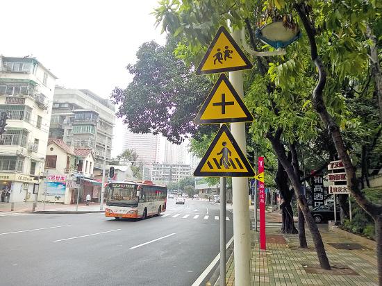 按照这位市民的观点,记者在该段农林下路上,陆续发现其他“乌龙设置”。只见工作人员在农林下路靠近东风东路口,设置一个禁止停车标志;在被市民反映“乌龙设置”的红绿灯前,设置了“学校附近”、“交叉路口”、“斑马线”等提醒标志。根据这些标志设置方向,记者发现全部都设置面朝南方。若按显示该路段北往南单行设置,司机确实只能通过倒后镜才能看清标志和红绿灯。