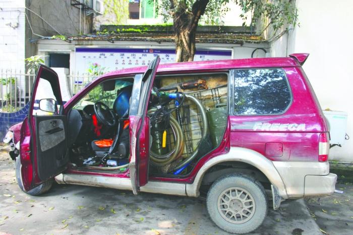 车内除驾驶室座位尚在,其余座位均被拆下,装上了油桶、切割机、抽水泵等大量工具,连副驾驶位置也装上了油桶。此外,民警还在车内发现了大量开锁工具、少量的冰毒和一把自制枪支。