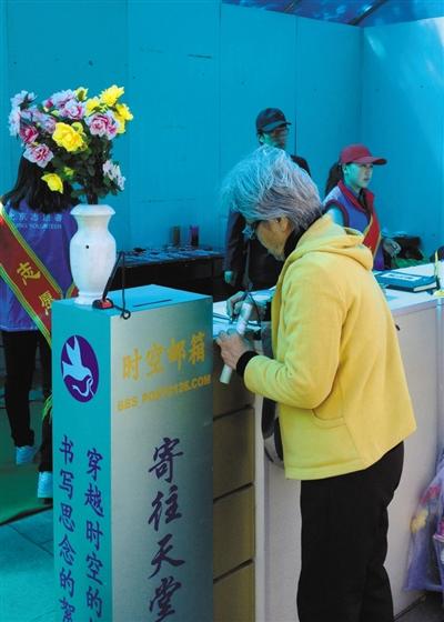 八宝山人民公墓一服务点,一位市民正写信,希望通过“时空邮箱”,寄托哀思。 新京报记者 刘珍妮 摄