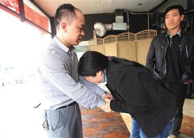 朱冬莲的二妹给餐厅老板徐传彬鞠躬,表示感谢。在徐传彬的帮助下,朱冬莲才能在失散25年后找到家人。