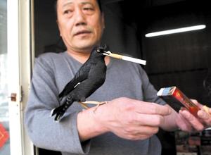 男子养两只“土匪”八哥:一只爱抢烟一只爱翻兜