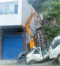 挖掘机侧翻砸烂山坡下小货车 所幸无人伤亡