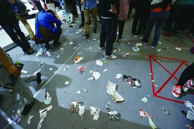 昨日中午,记者在E3展馆看到,这里开始限流后,满地的各种广告、宣传资料盖住了原来的灰色地毯。