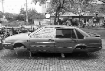 昨天下午,记者首先来到凌兆路济阳路。在距离路口仅十多米的凌兆路南侧人行道上,一辆江西牌照的白色桑塔纳十分惹眼,轿车上布满灰尘,车头的铁皮已经生锈,到处都是破裂的口子,车身上写满了“收购报废车”的小广告。更令人大跌眼镜的是,轿车的四个轮胎已经无影无踪,整个车身仅靠车底下放着的几块砖头支撑着,如果有人稍稍用力推一下,车子就会趴在地上了。