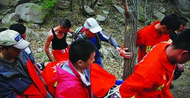 女游客下山途中脚骨折困山中 十多人接力抬回她
