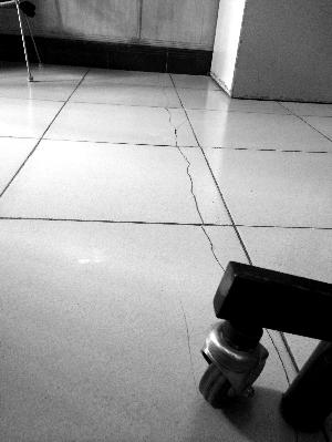 在二层住户杨女士家中,记者看到厨房、餐厅、客厅到卧室的瓷砖上,共有6条东西方向的裂纹,较长一处超过7片粉色瓷砖连续断裂,“这种满断,绝对不是砖质量差或者自己打碎的。”她说。另外,卧室的两扇窗户中,已有一扇因上端卡住墙体而不能正常开合。随后记者又来到她家对门焦女士家,发现地面瓷砖上也有多条裂纹,且与杨女士家的位置近乎相同,“说明砖下面是连着裂过来的。”她一脸焦虑。记者看到,两个单元一共20户居民。
