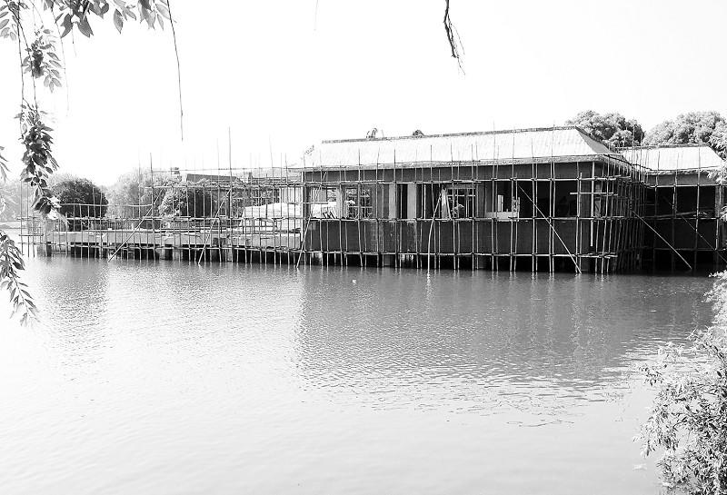 附近桥梁社区居民介绍,此处水上平台建筑,十余年前施工时就因无手续被执法部门叫停。不料,在严控违建的今天,违建平台上竟然搭起了房子。现在工人介绍,他们于今年4月前来施工,除对原有结构进行修缮外,还在平台上搭建建筑物。记者见到,水上平台上堆有角钢,搭建的七八间房屋已初具雏形(如图)。现场工人称,准备建一个“露天游泳池”。