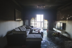 昨日上午,记者在现场看到,2305房一片狼藉,这套两室一厅的房子,大厅内墙壁漆黑一片,墙角位置还残留着油斑。两间卧室落满一层黑色残骸,所有物品被烧,墙壁红砖外露出来。