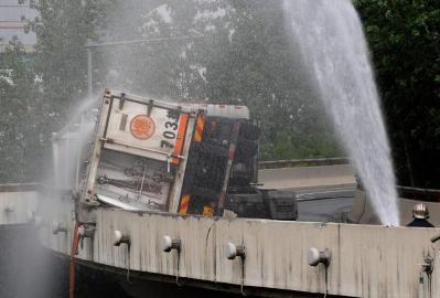 5月12日,成都三环路天府立交桥,一辆天然气罐车侧翻。