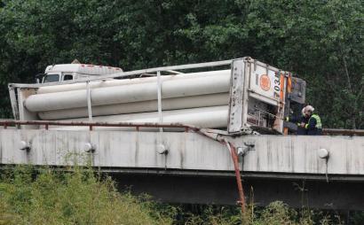 发生侧翻的地点正是一个右转弯的坡道。记者在现场看到,一辆白色重型半挂牵引车的车身倒向了左侧,匝道上的栏杆已被撞毁。在侧翻的车辆旁边,一个水枪正对着车身不停冲水。“现在是在降温、稀释,之后我们还会进行降压处理。”现场一名负责人说,虽然目前尚无气体泄漏,为安全起见,119和110正在采取措施转运气体,防止二次事故。