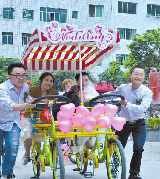一辆被“精心打扮”的4人自行车上,身着洁白衬衫的新郎蒲爽正与他的伴郎一起,蹬着“主婚车”,前去迎接他的新娘。他们身后,是一个由近40辆自行车组成的车队。