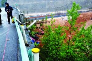 一名报警人称,事发当时他正在附近洗车,突然听到一声巨响,也不知道这辆挂车怎么就坠下了大桥。(张晓龙 本报记者 吴如雄)