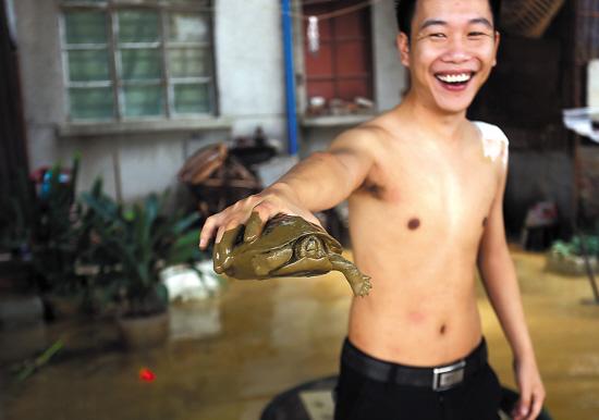 流溪河江高岸边居民从积水中抓到一只乌龟 羊城晚报记者 梁怿韬 摄