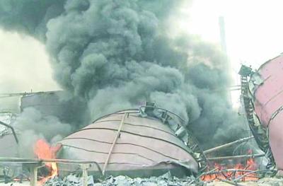 南京扬子石化炼油厂昨爆炸 3小时大火烧塌3巨型铁罐