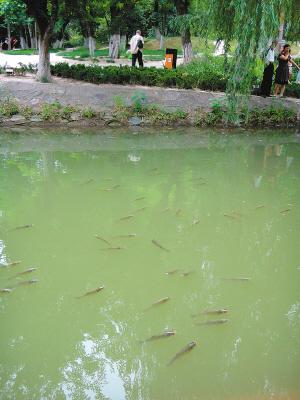 8日下午,兴庆宫公园北门西侧的湖水沉淀池里,突然冒出了几百条白鲢鱼,由于气温高,不大的沉淀池里又挤着这么多鱼,很多鱼都因为缺氧浮到了水面上。公园工作人员介绍,沉淀池里的这些鱼是市民放进去的,现在,公园方面正想办法将这些鱼转移到湖里去。