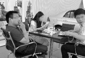 红山路一家汽车4S店, 一名顾客在大厅内吸烟。