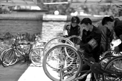 “其实很多自行车稍微整修就能用,卖废品确实太可惜了。”于是,清华大学绿色大学办公室和保卫处一起想了个主意:重新拼装,再次利用。经过校内修车摊的修车师傅和保卫处巡查队员的努力,已经“复活”的自行车码放整齐,还被统一喷上了“绿色出行”的标识。