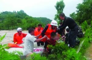 昨日,因连降暴雨,兴仁县城北办事处大桥河村5位老人和孩子被困洪水中。接警后,该县消防官兵紧急救援,利用冲锋舟成功营救被困人员。目前,被救村民已平安住进亲戚家中。(李浪浪 刘永松 摄)
