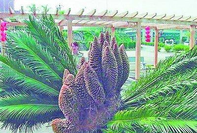 在这个小院里,大大小小种了50多株铁树,一大半铁树开了花,有雌有雄。一株铁树王,竟一下子开出25根花柱。工作人员说,这些铁树都是2002年种下的,种下3年后就开始陆续开花,平时养护并没有特殊待遇。
