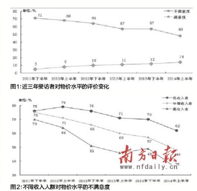 广州社情民意中心认为,近三年来经济增速放缓,CPI增幅缩小,民众对物价水平的不满意度大幅下降。“控通胀、稳物价”的成效,在民众心理上的效果已有所显现,然而与民众期盼仍有明显差距,评价并未发生根本性好转。