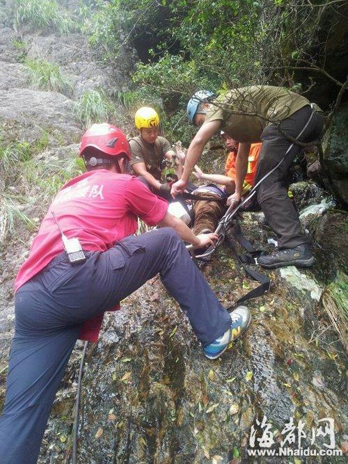 “我们判断伤者很可能就在附近,一边喊,一边吹哨子。”省山地救援队一位搜救人员告诉记者,继续搜索了一段时间,终于听到了呼救声,大家朝着声音赶过去,于中午11时30分许,在一处近二十米高、七八十度的崖壁上,看到了被困男子黄某。当时,被困崖壁的黄某已经瘫软,瀑布的水流顺崖壁而下,他的手等处,在水中已被泡成了白色。
