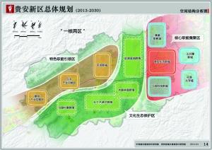 新区将确定实施“一核两区”的空间结构,其中,贵安生态新城、马场科技新城、天河潭新城、花溪大学城、清镇职教城将构成核心职能聚集区,此外还有包括平坝新城、乐平产业功能区、蔡官产业功能区在内的特色职能引领区,以及以屯堡村寨群落、手工艺遗产群落、水脉林盘群落、滨湖湿地群落为主的文化生态保护区。