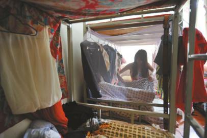 记者来到订好的2号房的床位,这间房之前已经住了4个人。环顾四周,每张床的床头都挂着满满的毛巾和衣物,有的床栏杆上挂着插线板。除了3张高低床,这间约15平米的房间里还放了一个废弃的衣柜,一个床头柜,一个小课桌和一张梳妆台。有人住的床上都铺着房东提供的统一的床具,床下无一例外塞满了鞋子、脸盆和行李箱等物品。