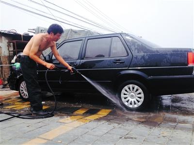 前日,昌平区立水桥附近,近千米的路上约有30家洗车店,被称为“洗车一条街”。多家店门前停放着轿车,工人们正用喷水枪清洗。