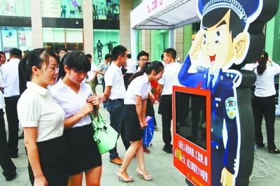 昨天,武汉警方防范电信网络诈骗宣传月启动,百名“防骗电子卡通警察”正式亮相街头上岗。警方介绍,今年9月前将陆续有550名“防骗电子卡通警察”走上市内银行网点、大专院校、大型商场等部位,提醒市民防范电信网络诈骗。
