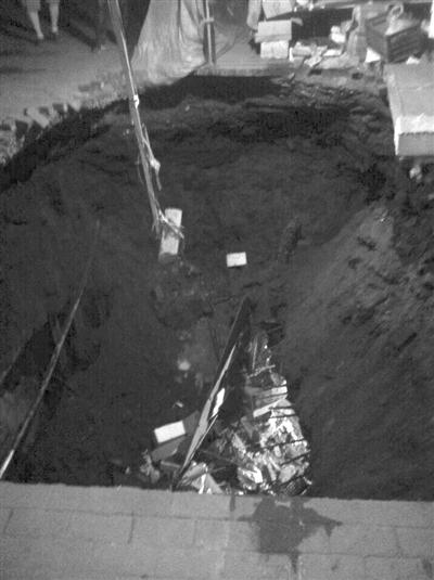 据附近仓买店主张女士介绍,当天晚上她和家人朋友正在店门前喝酒,突然听到“轰”的一声响,她以为是自己家店里的货架倒了,抬头一看,是门前不远处的水果摊掉进坑里了。张女士走到坑附近一看,坑里都是土,掉进坑里的水果摊主被埋在土里,意识还保持清醒。