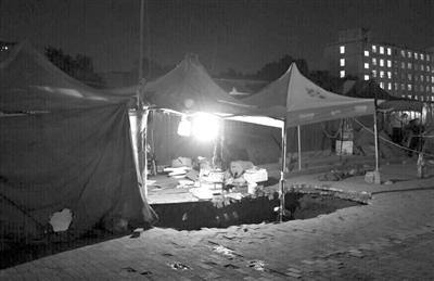 事发时,有许多水果摊床在营业。记者赶到现场时,有人正对大坑苫盖,坠入坑中的男子已被送往医院救治。