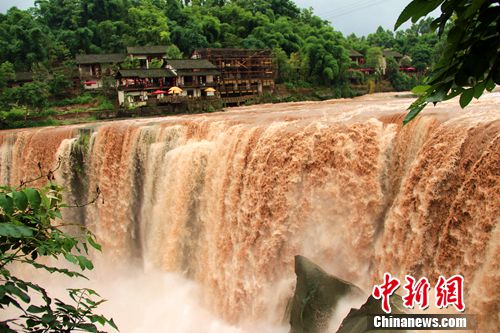 广安红色影视城内的湟龙峡大瀑布,据称系亚洲第一宽瀑。中新网 杜雯雯摄
