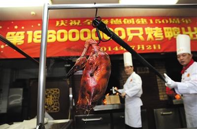 到全聚德吃烤鸭,每桌客人都会收到一张记载着全聚德烤鸭编号信息的“烤鸭纪念卡”,告知吃的是第多少只烤鸭。在昨日的150岁庆典仪式上,烤鸭师傅们拿起挑鸭杆,现场把刚烤好的一只鸭子挑出炉,随后请老师傅拿刀片开,“这是第196000000只烤鸭!”