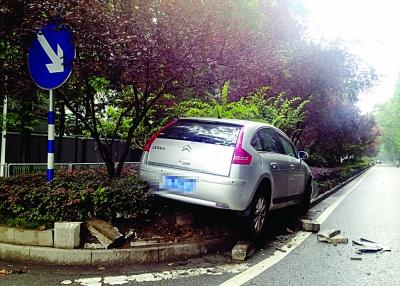 昨日中午,在南京东南大学附近的进香河路上,由于雨天路滑,一辆私家车不慎方向失控,“骑”上路边绿岛,车头损毁严重。据目击者称,当时车速有些快,司机遇到突发情况后采取措施不当,这才冲上绿岛的。(吴胜 摄)