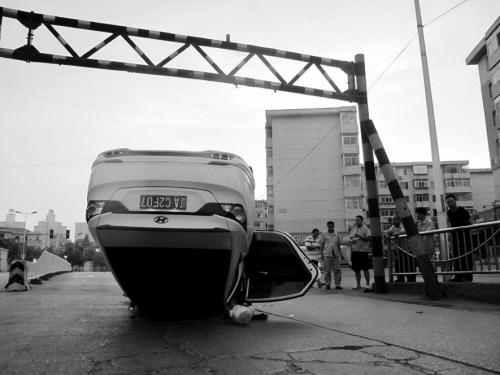 轿车午夜撞上限高杆翻车 俩女孩吓得抱头大哭(图)