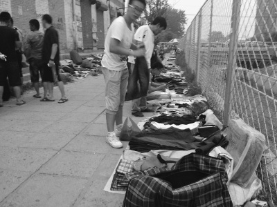 6月27日,记者来到大钟寺四道口路,这条路北连北三环,东邻大钟寺中坤广场,呈南北走向。从道路北口进入,路两边停着不少车辆,在车辆之间的空地上,每隔几米就有一个摆满各种衣服和生活用品的地摊,三三两两的行人围在地摊前挑挑拣拣。记者注意到其中一个地摊上,分类摆放着裤子、上衣、鞋和生活用品,记者拿起几件上衣看了看,衣服的领口、袖口有汗渍和污垢,凑近一闻还有股难闻的气味。