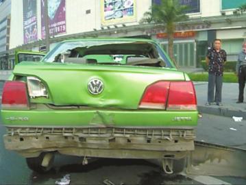 7 月2日清晨6点过,成都一品天下大街北路口,停放着一辆破烂不堪的出租车,计价器、后视镜、挡风玻璃、后排座椅、前后保险杠等,统统不见了踪影,车身后面的地上还躺着一条被撞断的护栏。