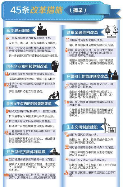 7月2日,记者从四川省政府官网获悉,省政府下发了《关于贯彻国家发展改革委<深化经济体制改革重点任务意见>的通知》(下简称《通知》),以45条具体改革措施,从政府职能转变、财税金融价格改革、国有企业和科技体制改革、户籍和土地管理制度改革、开放型经济新体制建设、事关民生改善的各项体制改革及生态文明制度建设等7方面就2014年深化经济体制改革的重点任务进行了部署。