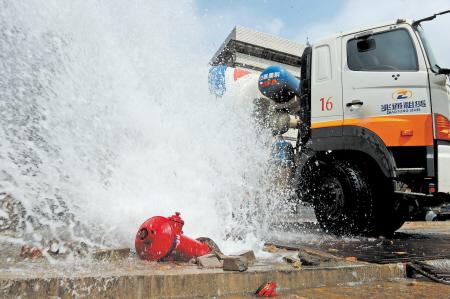 昨日下午2时多,位于长沙市火炬路与紫薇路口东南角的一处工地外,因进出的一辆水泥罐车将消防栓撞倒,导致自来水向上喷射数米,哗哗流了半个多小时。长沙供水有限公司派工作人员对消防栓进行了紧急抢修。(石祯专)