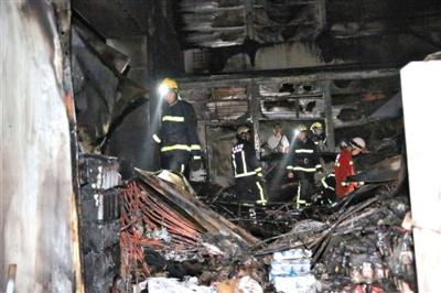 昨天晚上9点,在事发仓库附近,空气中弥漫一股烧焦的味道,消防员正在清理现场。现场几根五六米高的桥墩被蓝色铁皮包裹着,已不见明火,仍可看到里面被烧焦的饮料、牛奶包装。