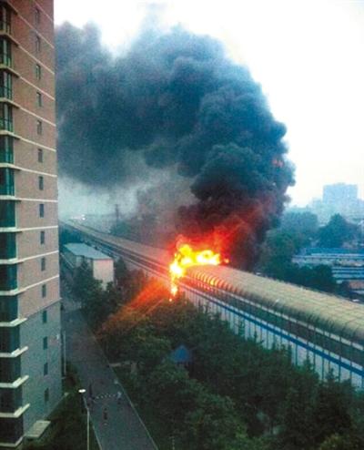 图片中可看到,13号线一段地铁高架桥上有明火。