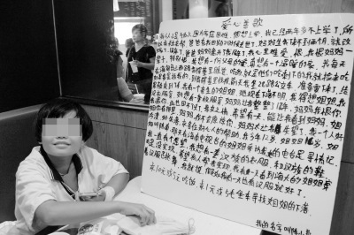 记者注意到,小草的身边放着一块写着“爱心善歌”的白板,上面密密麻麻地写着她流浪的原因和诉求。小草说,她是一个孤儿,母亲生下她不到两个月就改嫁了,她4岁时父亲也去世了,是奶奶把她和姐姐抚养长大,她来海口市区就是想寻找妈妈。