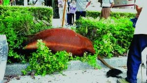 据了解,这头黄牛冲到凯里原1路车终点站后,拐入博南新区,依然是横冲直闯,行人车辆纷纷逃窜或者避让。牛主焦急万分,请民警赶紧想办法制止牛的“极端行为”。民警见事态严重,在征得主人的同意下决定开枪将其击毙。当牛行至凯里行政中心门口东侧的绿化带时,民警果断开枪,受惊黄牛应声倒在了绿化带中。(杨帆 本报记者 吴如雄)