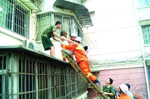 桃花消防中队官兵赶到现场后,将消防车开到女子所在的二楼阳台下,借助消防车的高度架设了六米拉梯,消防人员借助拉梯将受伤女子抬了下来,送到现场等候的医务人员处,并将她带回医院检查。(井正伟 记者 辜砚琦 文/图)