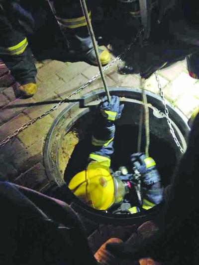 消防员下井救人。