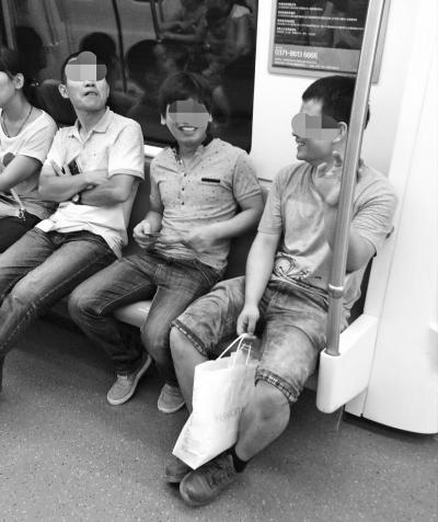 在同节车厢的扶手处,站着三位拎着旅行箱的年轻小伙儿,他们说话的音量一点也不亚于这“姐妹俩”,正聊得起劲,其中一个小伙子的手机铃声响起,劲爆的音乐惊吓到了身旁的乘客,“喂喂,我还在地铁上,一会儿就到……”年轻人扯着嗓门“喊”电话,旁边的一位女士不堪其扰,无奈地摇了摇头。
